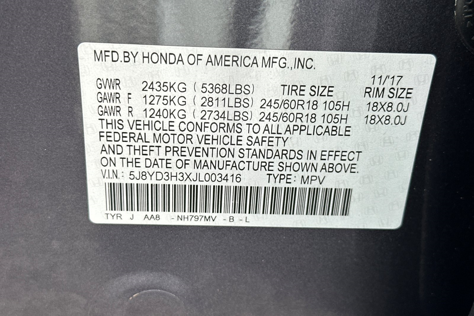- VIN : 5J8YD3H3XJL003416