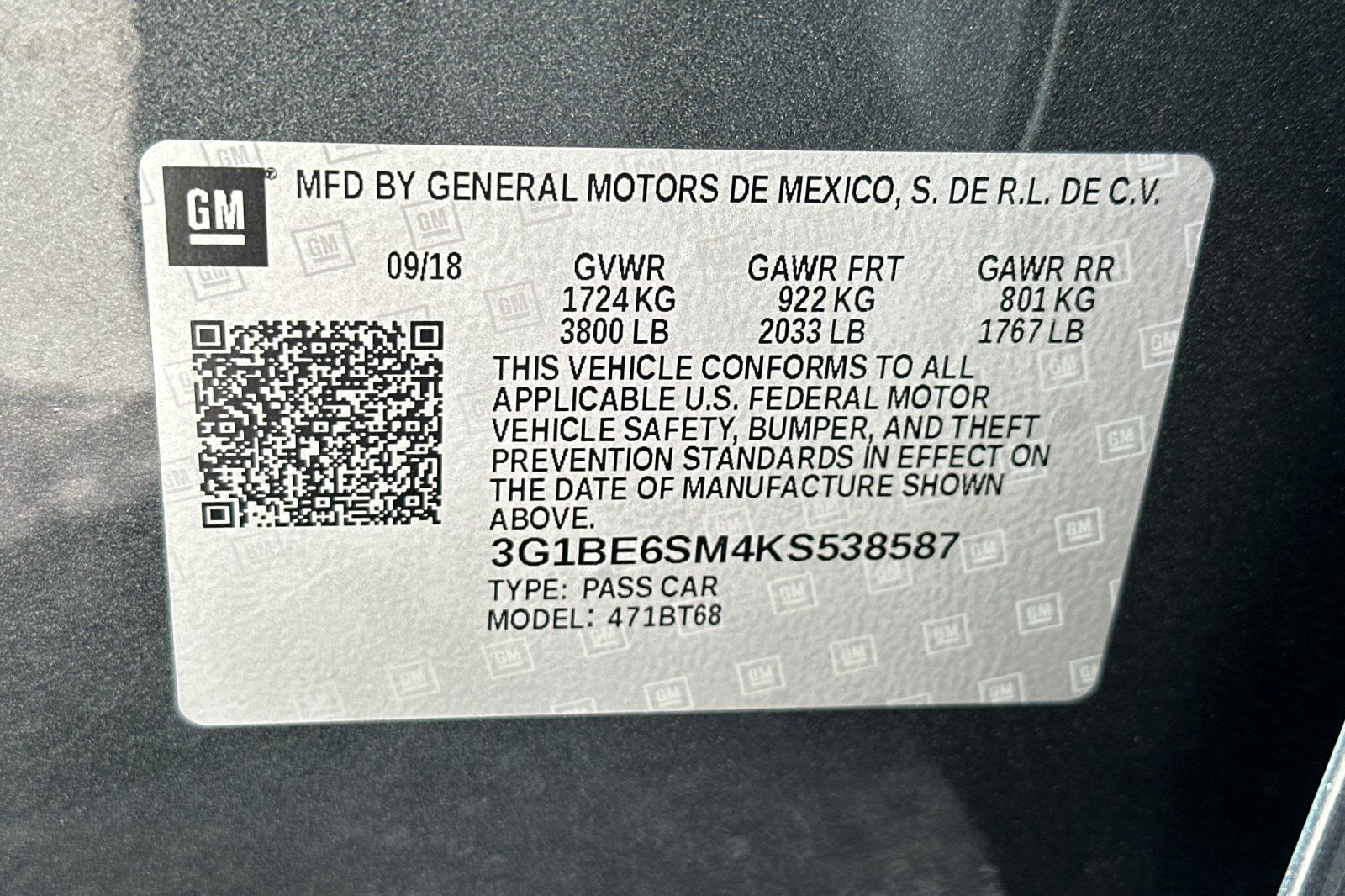 - VIN : 3G1BE6SM4KS538587
