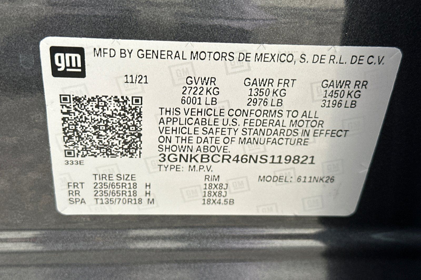 - VIN : 3GNKBCR46NS119821