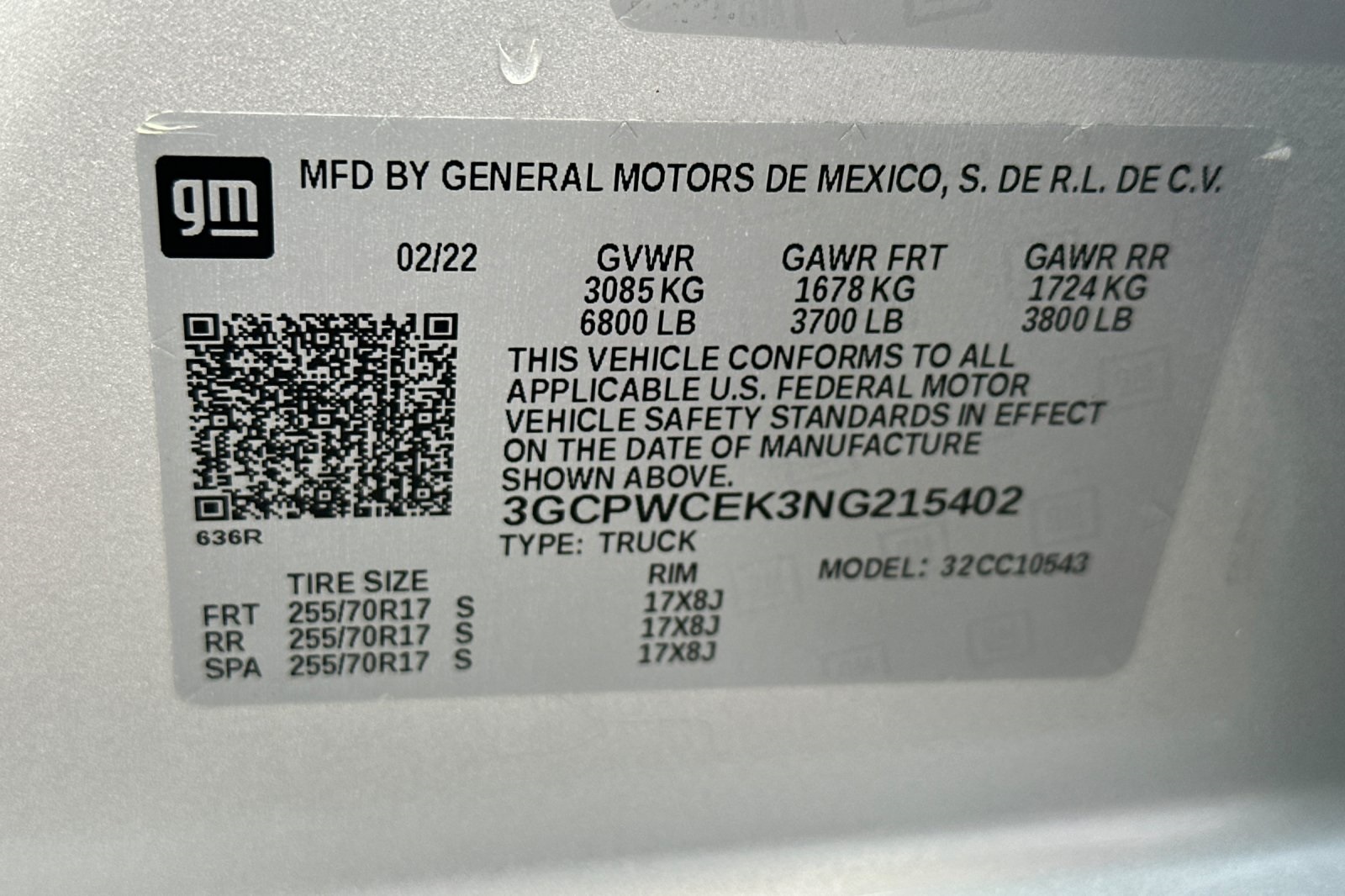 - VIN : 3GCPWCEK3NG215402