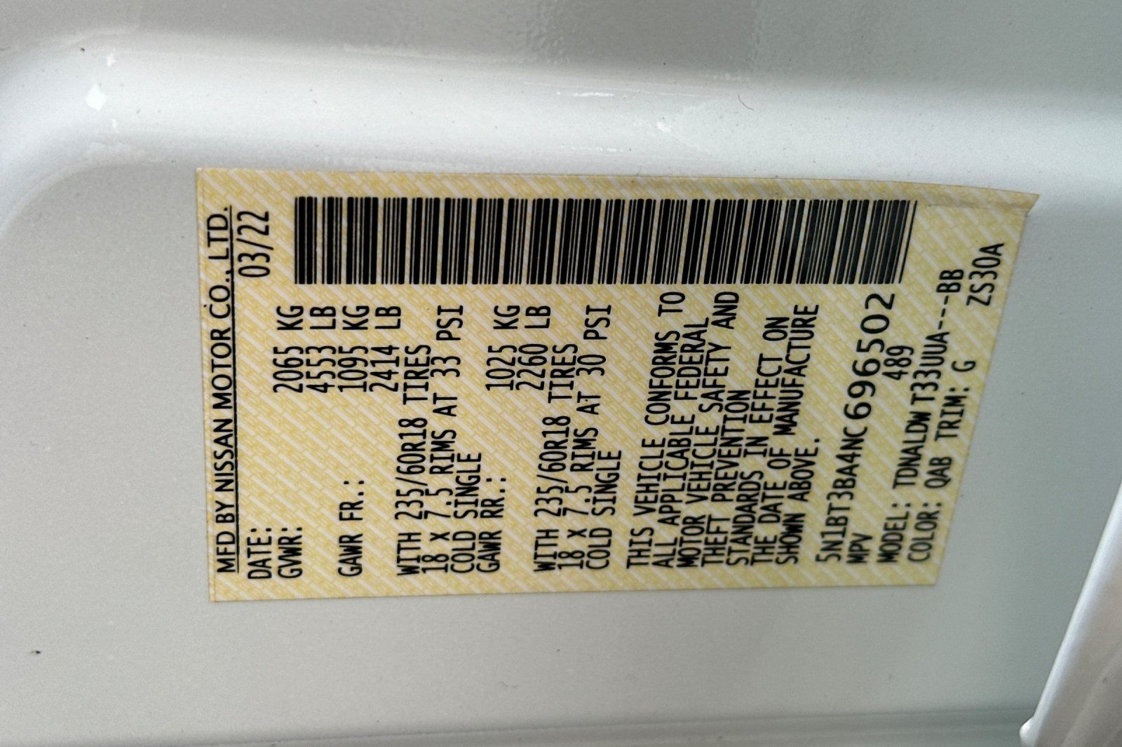 - VIN : 5N1BT3BA4NC696502
